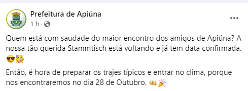 Na manhã de segunda-feira (29) a Prefeitura municipal de Apiúna anunciou através de sua rede social, a data da próxima edição do STAMMTISCH 2023, que ocorrerá dia 28 de Outubro.