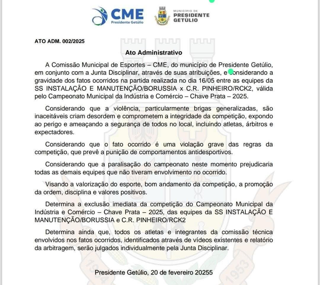 A Comissão Municipal de Esportes (CME) do município de Presidente Getúlio divulgou nesta semana um ato administrativo determinando a exclusão imediata das equipes SS Instalação e Manutenção/Borussia e C.R. Pinheiro/RCK2 do Campeonato Municipal da Indústria e Comércio – Chave Prata 2025. A decisão foi tomada após uma briga generalizada ocorrida durante a partida entre as duas equipes no dia 16 de maio.