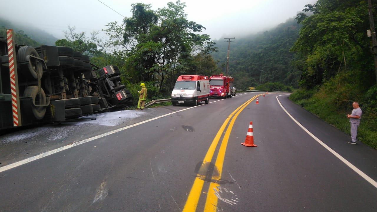 Bombeiros foram acionados por volta das 07h10min para atender uma ocorrência de tombamento de uma carreta na BR 470 na divisa dos municípios de Apiúna e Ibirama.