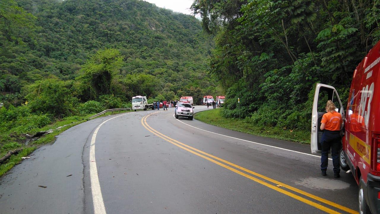 Segundo as informações o motorista da caminhão com placas de São José dos Pinhas(PR) que transportava adubos teria perdido o controle do veiculo e colidiu no rodado de uma carreta e na lateral traseira do veiculo de passeio e em seguida caiu no barranco que fica as margens da BR 470. O motorista da carreta e do veiculo de passeio não sofreram ferimentos já o motorista do caminhão ficou preso as ferragens.